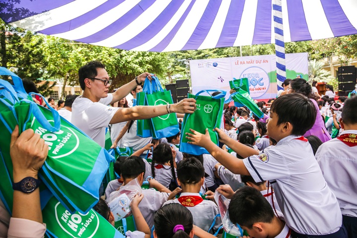Tình nguyện viên Oucru và Bayer Việt Nam cùng các em học sinh trong ngày ra mắt dự án